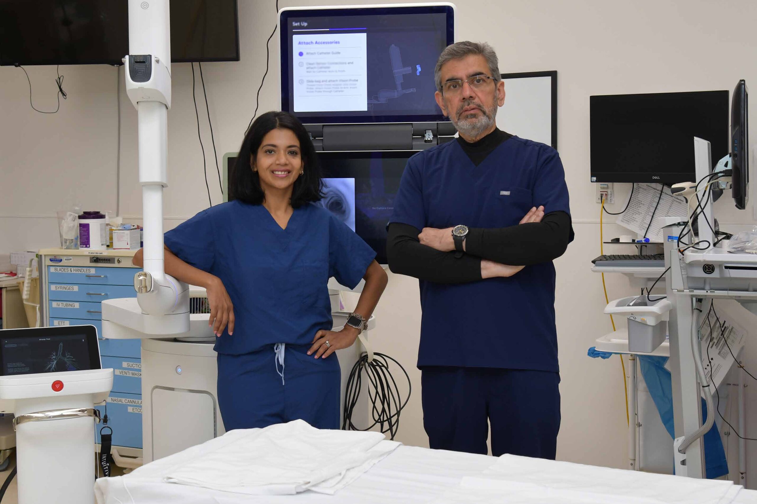 Manju Paul, MD, and Mansur Javaid, MD, are in the suite where they offer minimally invasive robotic-assisted lung biopsy which enables doctors to detect lung cancers much earlier than other methods. Upstate is the only hospital in the region to offer this procedure.