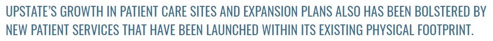 No matter where the new projects are taking place, whether it’s the hospital annex in downtown Syracuse or brandnew healthcare centers in rural areas, Galimi emphasized how each area of growth that Upstate pursues is aimed at meeting patients where they are.