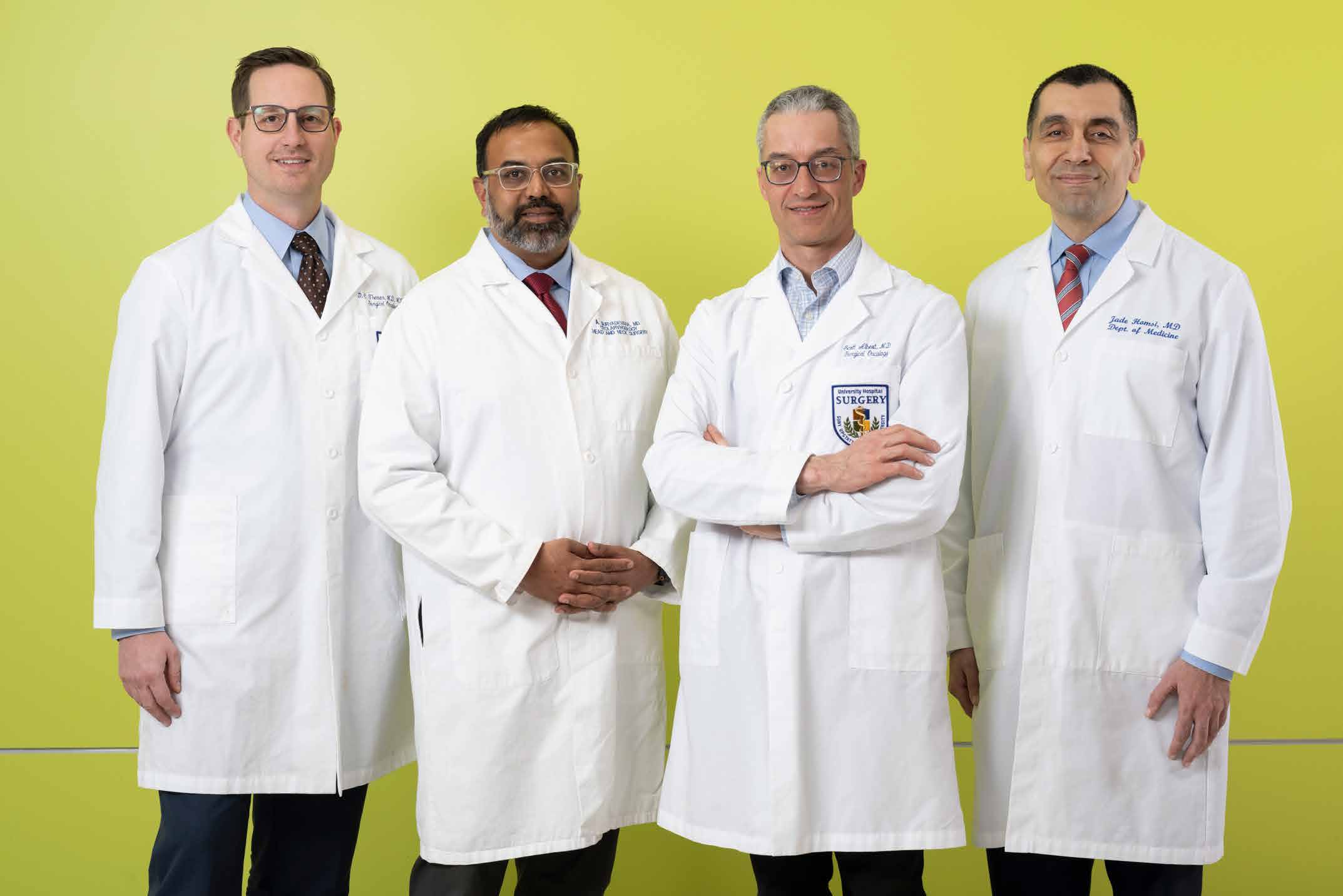 The Melanoma and Advanced Skin Cancer Program at the Upstate Cancer Center is the region’s only multi-disciplinary team and treats melanoma, advanced basal and squamous cell cancers and rare skin cancers such as Merkel cell carcinoma and others. From left: Daniel Thomas, MD, Amar Suryadevara, MD, Scott Albert, MD and Jade Homsi, MD.